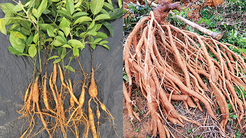 劣質苗結薯特點 收獲期主根為木質薯,其他分根薯細小,整棵重量少